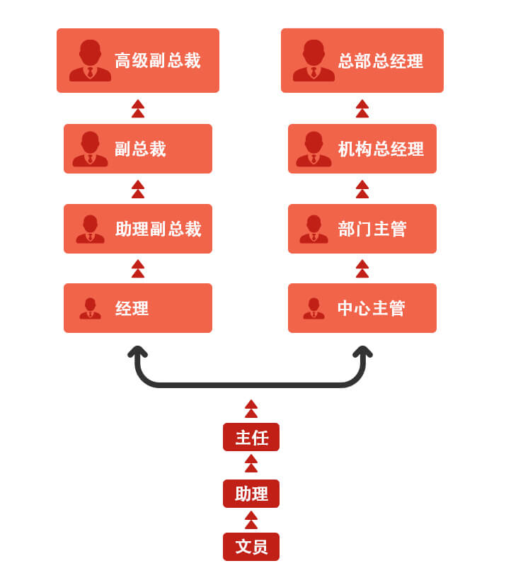 公司為員工在公司的成長與發(fā)展設(shè)計了專業(yè)職級和行政管理兩個序列,其中專業(yè)序列涵蓋14個職級,行政序列涵蓋8個職級。員工可以根據(jù)自身優(yōu)勢和意愿選擇職業(yè)發(fā)展道路,通過營造績效輔導(dǎo)的文化,總分公司人力資源部門與各層級主管將幫助員工在職業(yè)發(fā)展中提升崗位需要的專業(yè)及管理能力。另外,通過總分和機構(gòu)之間的輪崗計劃, 提升并拓展了員工的專業(yè)能力和發(fā)展空間。