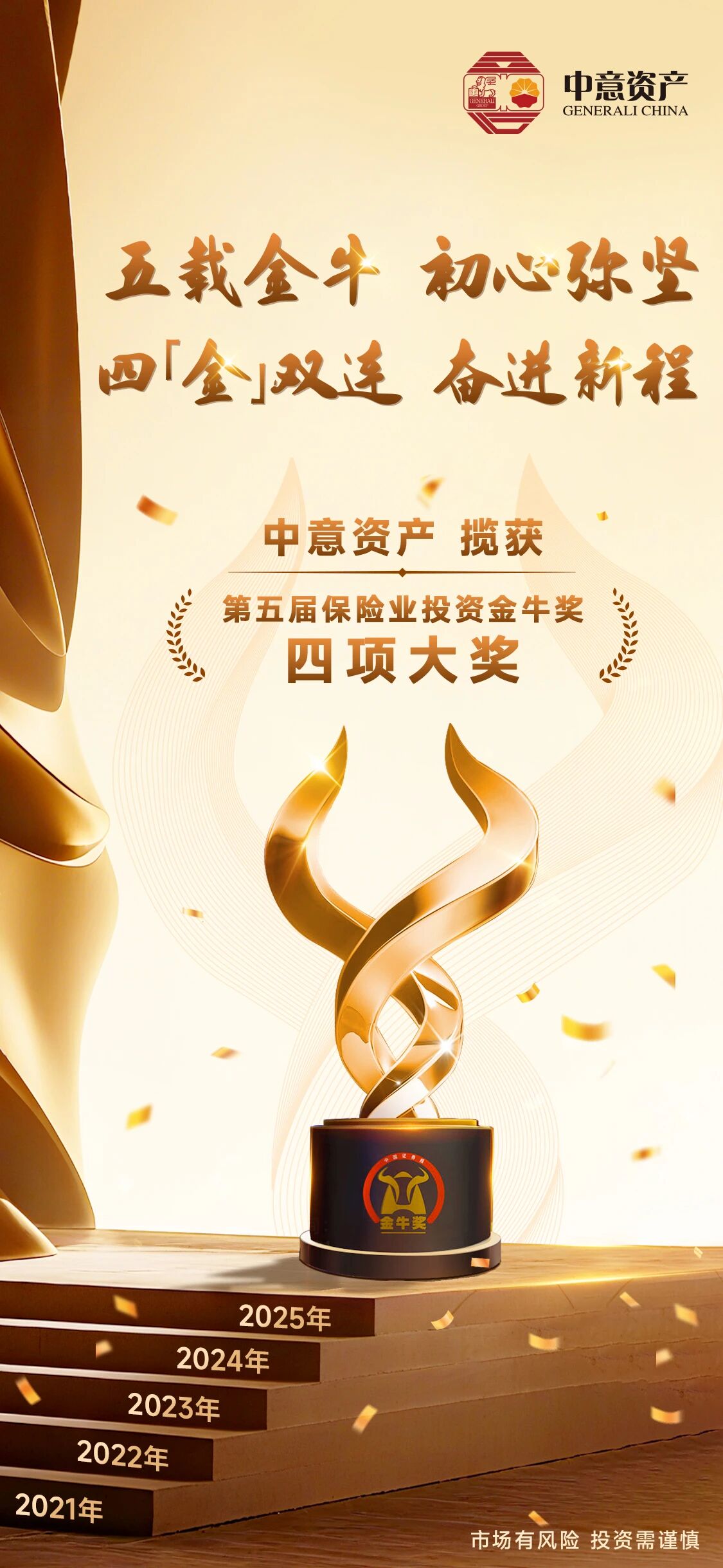 五載金牛,四“金”雙連!本次獲獎是中意資產(chǎn)連續(xù)第五年問鼎金牛,也繼2024年之后再次創(chuàng)下單屆攬獲四項金牛大獎的佳績,充分體現(xiàn)出市場對公司長期投資能力和資產(chǎn)管理水平的高度肯定。